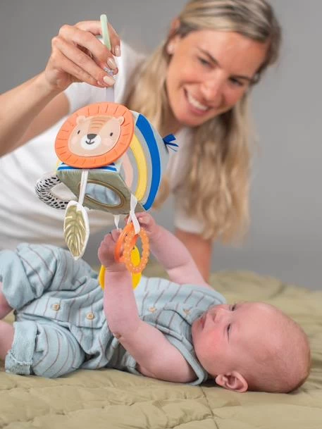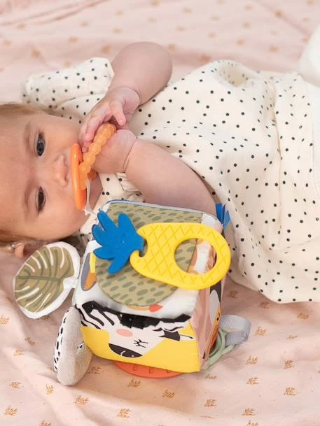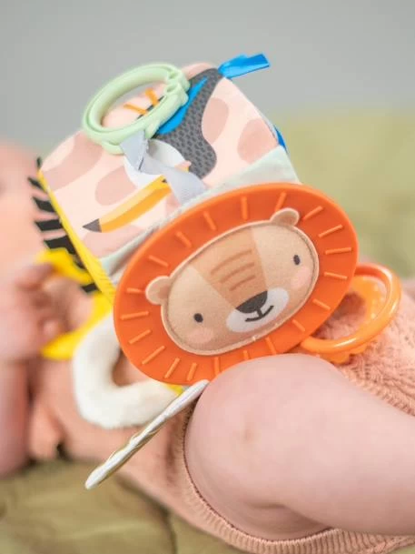 Un adorable cube en tissu sur le thème de la savane, avec de nombreuses activités: son carillon, miroir, hochet, anneau de dentition, anneaux en plastique, poignées en tissu et formes bruissantes.