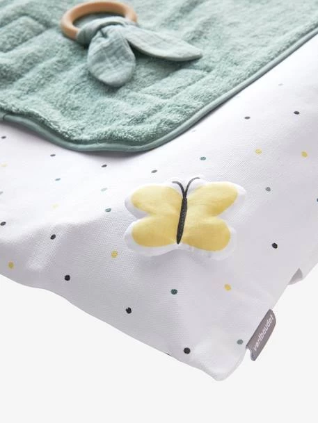 Matelas à langer en polychlorure de vinyle (PVC), garnissage en polyester et mousse de polyuréthane. Housse en bâchette pur coton.